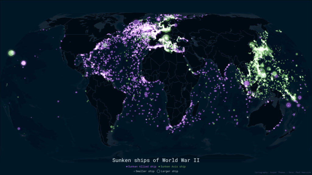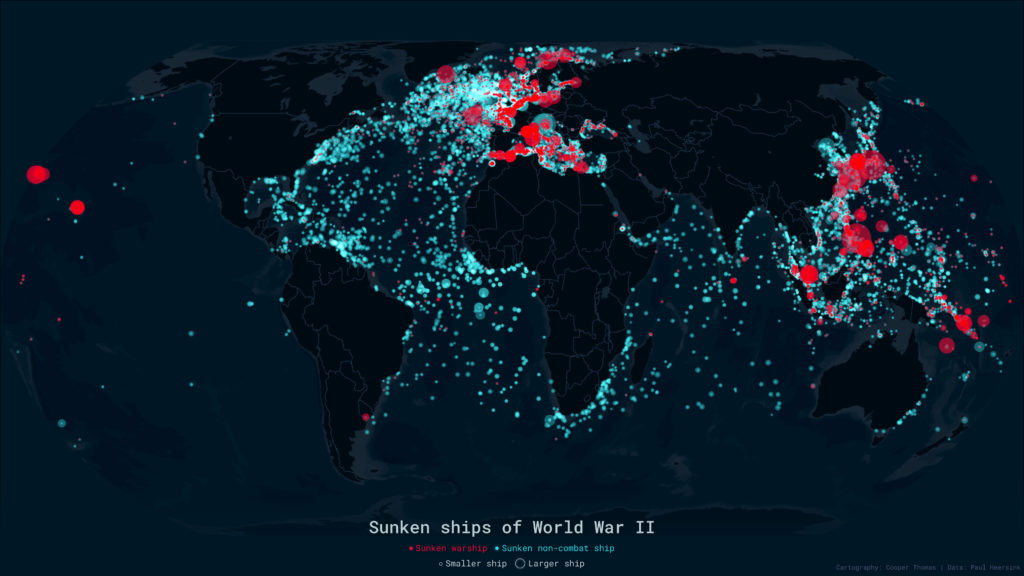 I created a series of static and interactive web maps (replete with a custom basemap style) for a story about World War II shipwrecks. Read the full piece here.