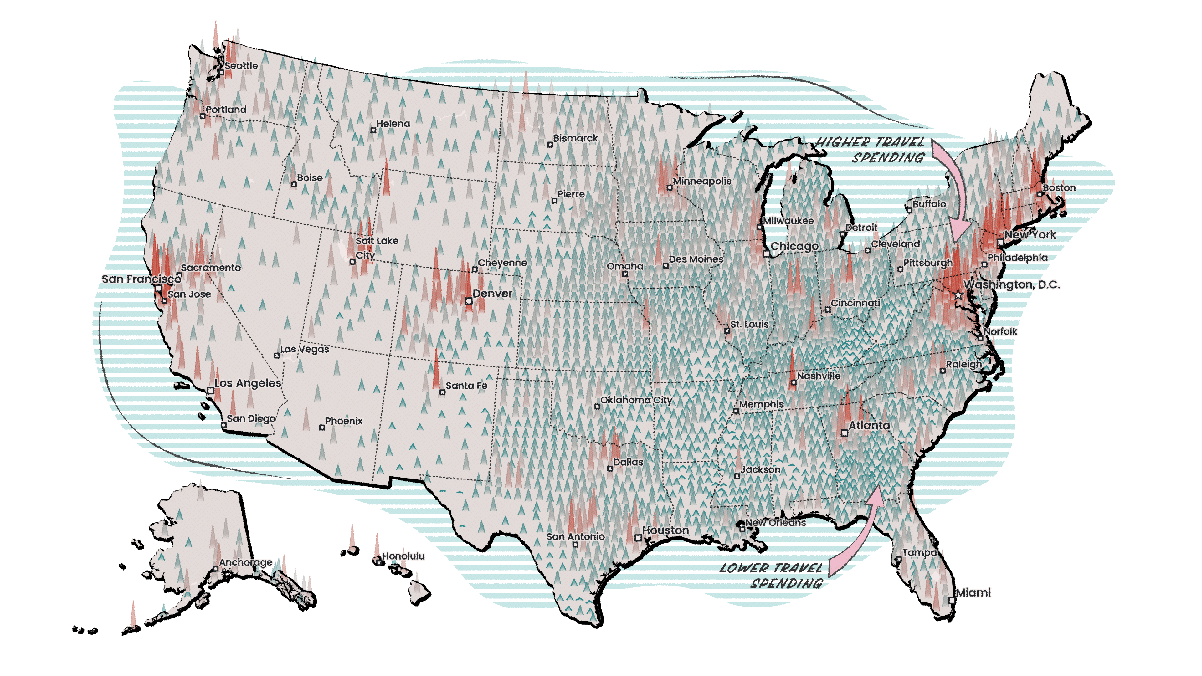 I worked with my colleague Heidi Daulton to produce this series of static maps for a multimedia story about U.S. travel spending habits. Read the story here.